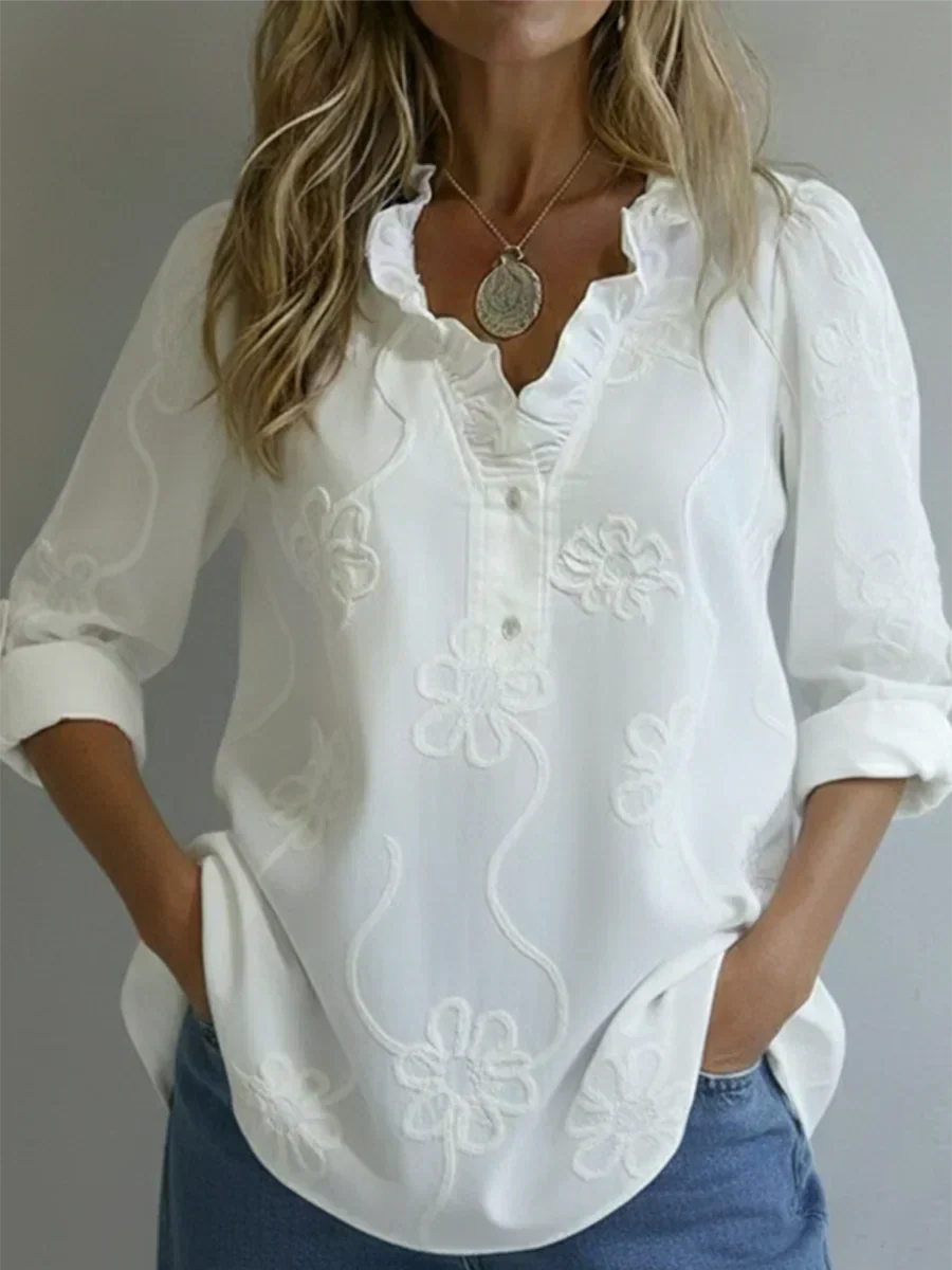 ✅Ruffle Collar Focus: The soft ruffle collar frames the neckline and gives the top a gentle statement. It adds shape near the face without needing extra styling pieces, creating a refined focal point from the very first glance. This feature helps the shirt feel finished the moment you put it on while keeping the overall silhouette light and balanced.